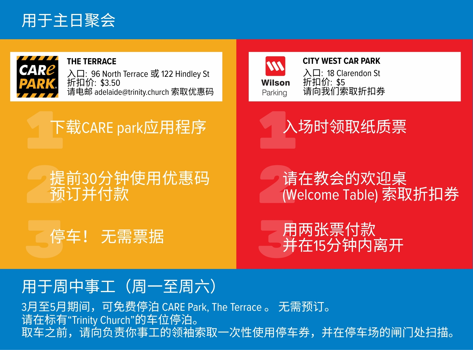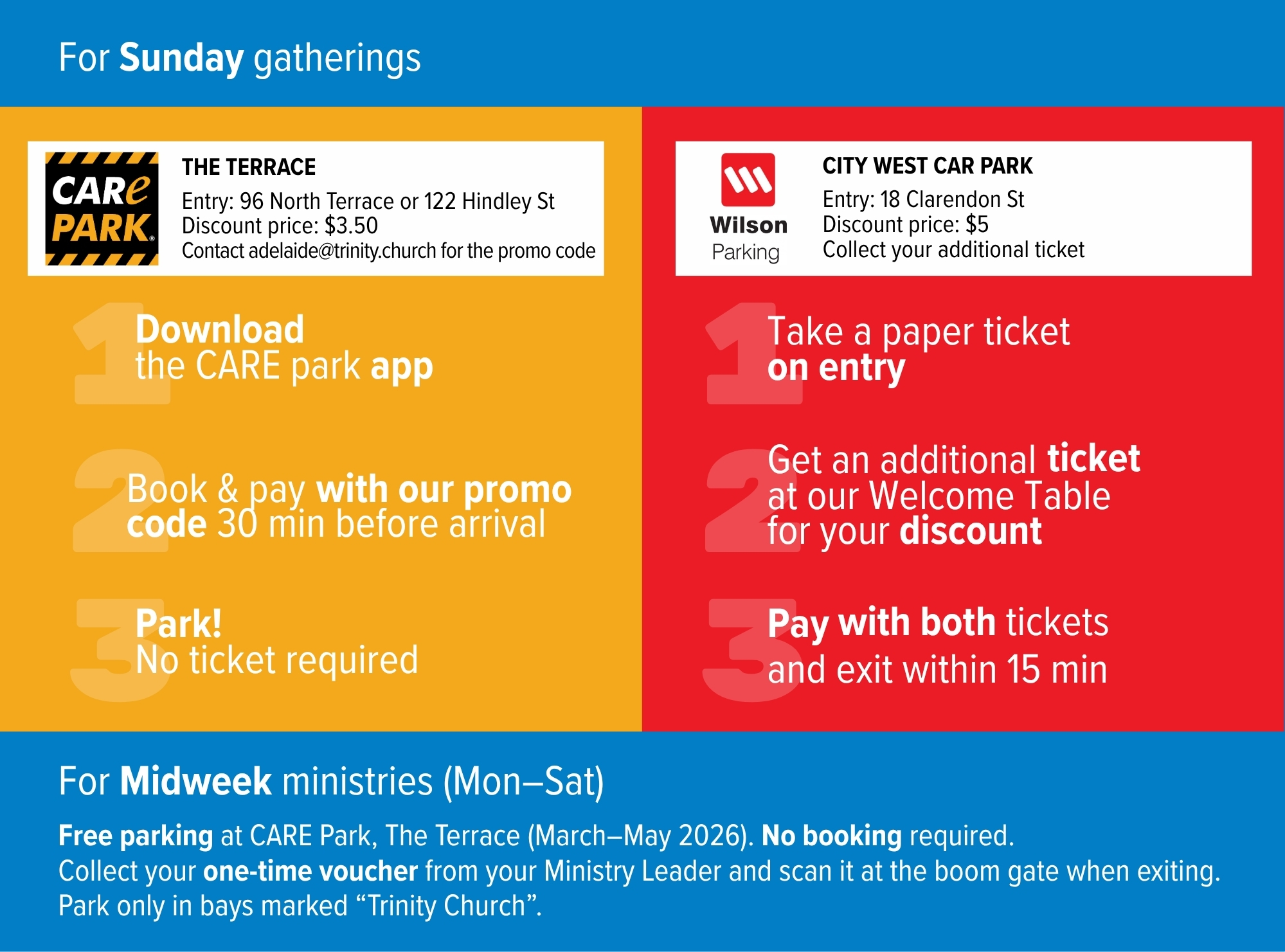From March to May 2026, free parking is available at CARE Park for midweek ministries.